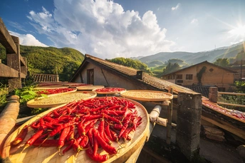 在丽水云和县云和梯田景区,邂逅了超治愈的晒秋场景,还有充满岁月感的古村,美到想原地定居😭 秋日的阳光慷慨洒落,村民们将红通通的辣椒、金黄的谷物等,满满当当地铺在竹匾里晾晒,色彩浓烈又鲜活,像是大自然打翻了调色盘,把古村的角落都染上了丰收的绚烂。古村本身也很有味道,石板路、老房子,处处透着古朴静谧,和热闹的晒秋画面交融,氛围感直接拉满,仿佛时间都慢了下来📸