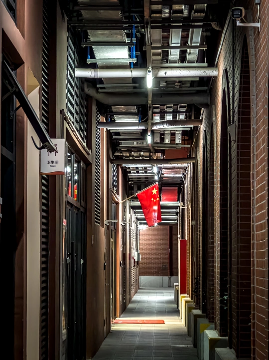 红砖与钢铁的交响,在时光的褶皱里低回。斑驳的墙面镌刻着工业文明的密码,管道如时间的脉络,在历史与未来的接口处蜿蜒。那抹鲜红自穹顶垂落,五星在灯影中摇曳,似从百年风云中走来的火炬,将民族的记忆与当代的呼吸熔铸成一束光。 工业遗存的筋骨间,当代艺术的血脉正悄然流淌。曾经的轰鸣化作凝固的诗篇,在管道与砖墙的对话中,生长出超越时空的叙事。卫生间标识的日常性与国旗的庄严在此偶遇,恰似平凡与崇高的量子纠缠,在光与影的量子场中,绽放出关于存在的深邃哲思。 红地毯铺就的路径,在工业空间的腹腔中延展成时光隧道。一端系着民族奋斗的史诗,一端指向未来的星轨。这面旗帜以其燃烧的姿态,赋予冰冷钢铁以温度,让沉寂砖墙重获呼吸,在时空的褶皱里,书写着一个文明关于传承与超越的永恒方程。