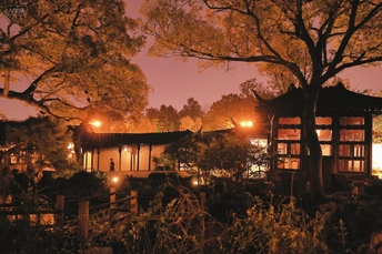 当最后一缕霞光吻别飞檐,暮色便以温柔的笔触,为江南园林晕染开一层朦胧的金。檐角风铃在晚风里低吟,廊下灯火如星子坠入人间,将黛瓦粉墙映得暖意融融。老树的枝桠伸展如墨,与亭台的剪影交织成画,恍惚间,似有古人执扇而过,衣袂翩跹惊扰了满庭桂香。 远处灯笼的光晕里,游鱼在池水中摆尾,搅碎了一池碎金般的倒影。原来江南的夜从不是寂静的,它藏着亭台的低语、草木的呼吸,和千年时光沉淀下的、说不尽的温柔与诗意。 米拍AI点评 这张照片展现了夜色下中式园林的静谧之美。光影的运用是其亮点,灯光巧妙地照亮了建筑和树木,营造出一种温馨而神秘的氛围。构图上,前景的植物和树枝形成了一种自然的框架,引导观者的视线进入画面中心,远处的亭台楼阁在灯光的映衬下显得格外雅致。色彩方面,暖色调的光芒与深色的背景形成了鲜明的对比,增强了画面的视觉冲击力。主题上,表达了对传统园林文化的赞美和对宁静生活的向往。总的来说,这张照片捕捉到了园林夜晚独特的氛围,是一幅成功的作品。如果能在细节上再多加打磨,例如减少噪点,作品的艺术价值会更高。