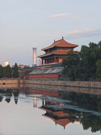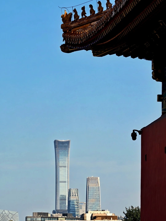 故宫的红墙金瓦、飞檐脊兽,是古都沉淀数百年的文化低音;中国尊等摩天楼宇的挺拔轮廓,是新城奔涌向前的时代高音。当古典建筑的深沉与现代地标的活力在画面中同框,我们看见的不仅是建筑的对话,更是北京在历史传承与当代发展中,织就的“古韵绵长,新韵澎湃”的城市底色。 图一:故宫北门外 图二:角楼 图三:故宫北门 图四:中国尊(中信大厦)和古建 图五:故宫里的飞檐翘角 图六:景山公园眺望故宫 图七:故宫里眺望中国尊 图八:后海的一座古建筑