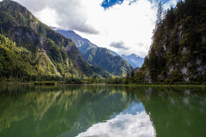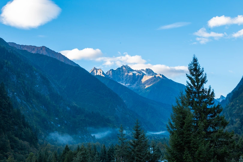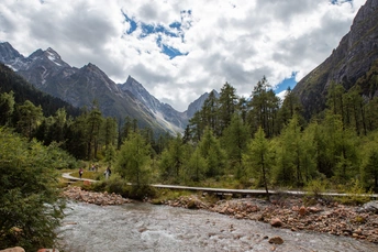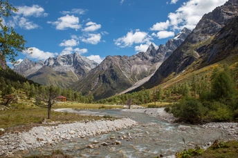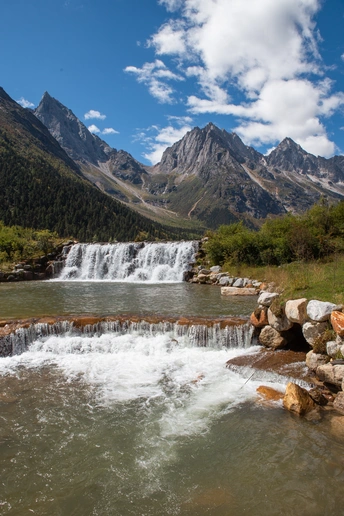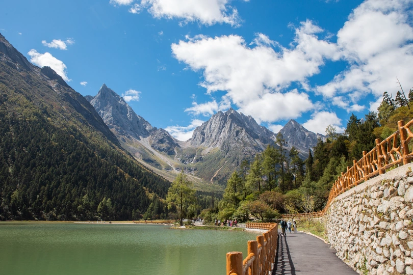 毕棚沟风景区位于阿坝藏族羌族自治州理县朴头镇,沟内奇峰峭立,峡谷幽深,冰川纵横,瀑布飞挂,野生动物物种类繁多。毕棚沟的古冰川中外罕见,规模宏大。融雪汇成溪流注入的龙王海清澈见底,倒映着周围的雪山彩林和蓝天白云。磐羊湖湖面宽广辽阔,水面清澈,四周雪山环绕,灌木丛生,倒映湖光山色,极美的高原海子,沿岸建有一条长长的环湖栈道。燕子岩窝背靠四姑娘山,有四姑娘背影的美称。燕子岩窝景点海拔3837米,叉子沟冰川、将军峰和女皇峰环绕着它,连绵不断高耸的雪山围出了一大片高山草甸,燕子岩窝虽然没有湖泊,但弯弯曲曲的溪流在草甸上潺潺流过,又是另一种风光。