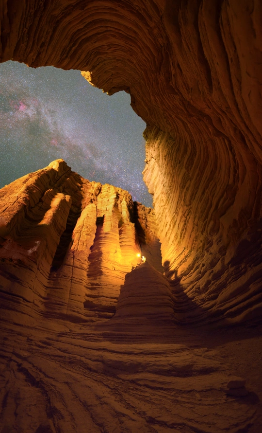 风在岩壁间刻下万年的纹理,像时光的指纹。 仰望那被沙色包裹的天窗,银河静静坠入这片寂寞的峡谷。 光照亮前路,也照亮孤行者的心。 在宇宙的回声里,我们都是微尘——却依然向光而行。