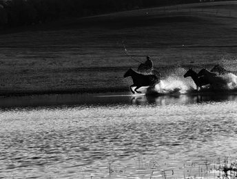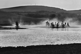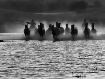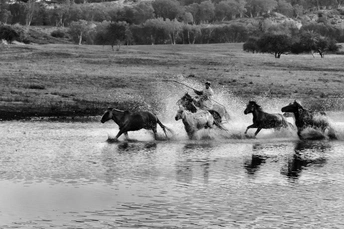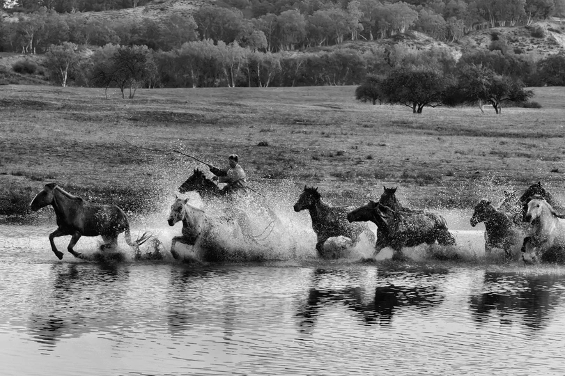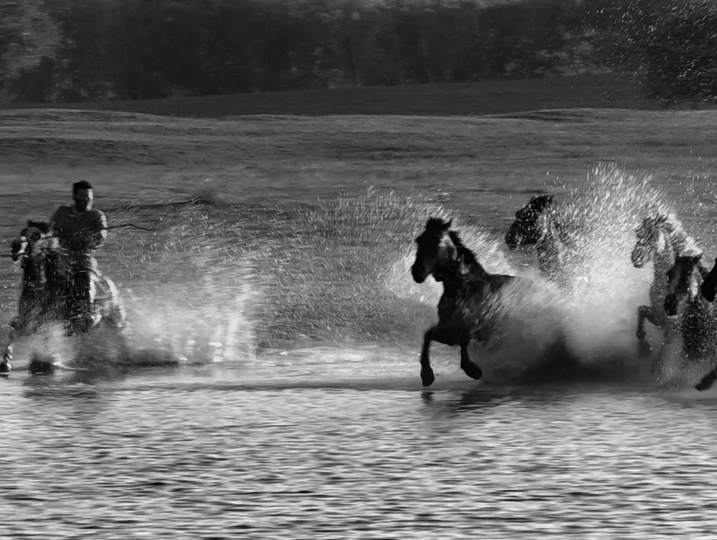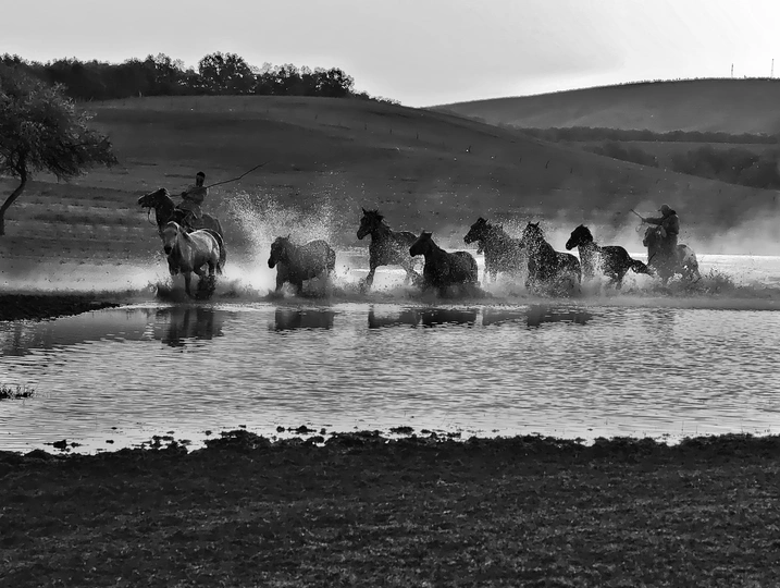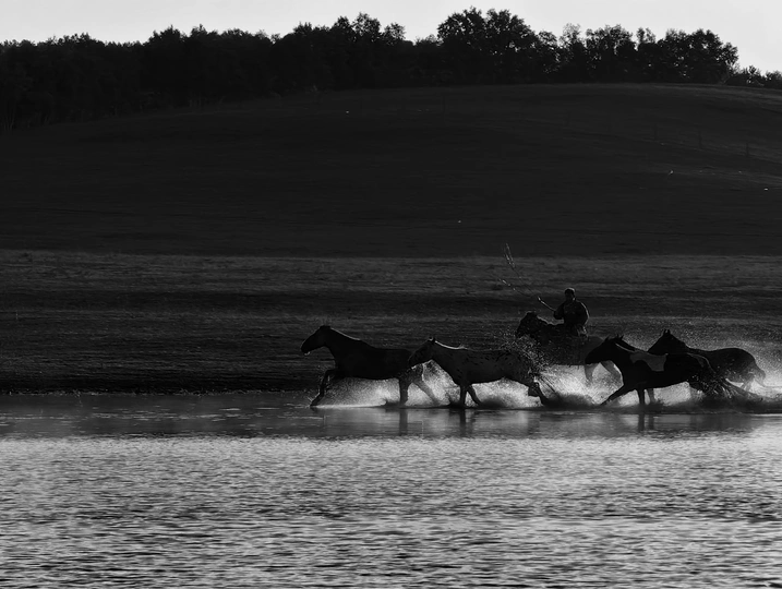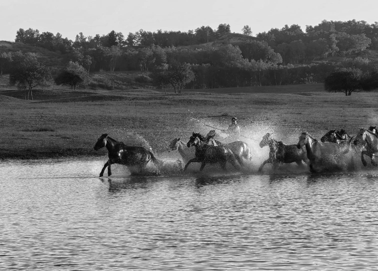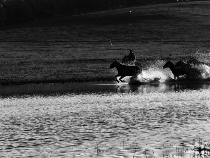 坝上的风把草原吹成了黑白画布,马群如墨色闪电闯入银波,每一次蹄落都砸出诗意的水花。黑白影像滤去了色彩的喧嚣,却让马的桀骜、水的灵动、草原的苍茫愈发刻骨,在时光的显影液里,晕染出自由与辽阔的永恒模样。