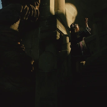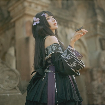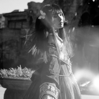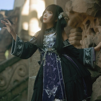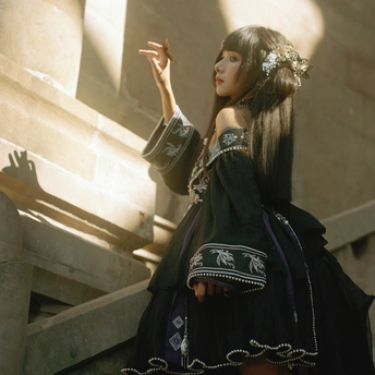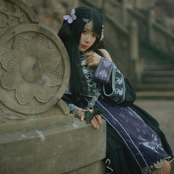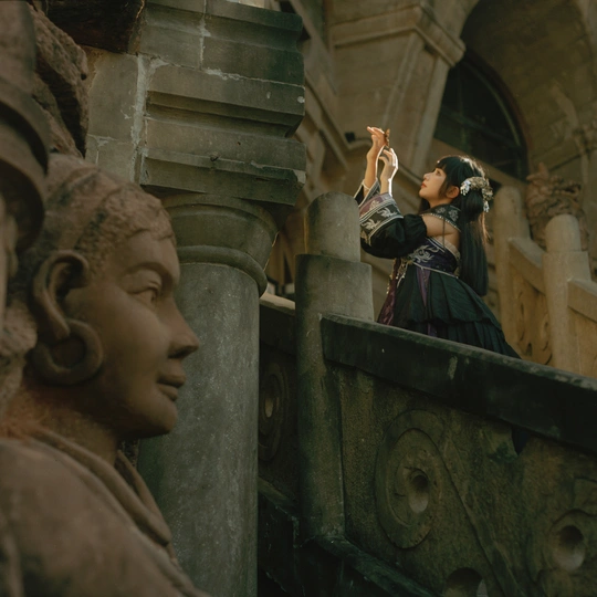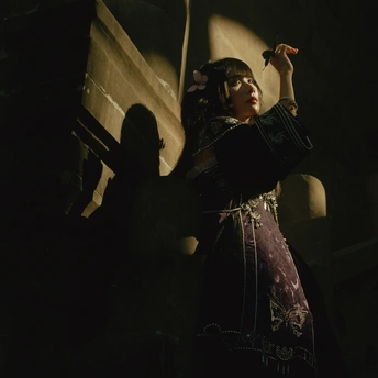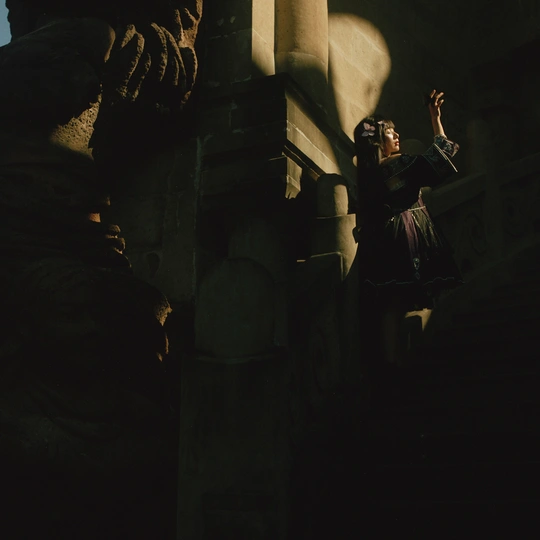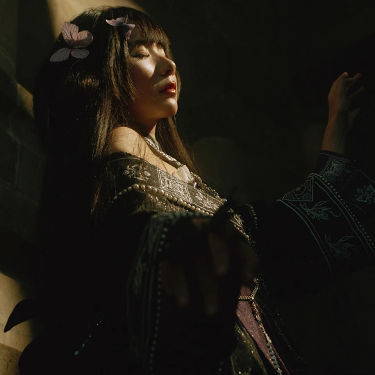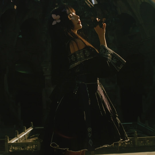 相机:哈苏500cm 胶卷:5203 老建筑里的光,总像被筛过一遍,昏昏沉沉的,却又能把细小的美都照亮。她指尖停着只蝴蝶,发间别着朵粉花,黑裙子上的银线在暗处闪着细弱的光——像把白天的明亮,和夜晚的神秘,都揉进了这一瞬里。 有时候觉得,人和这些旧地方是有感应的。建筑沉默着,可当有人穿着带故事的裙子、带着点天真的姿态站进去时,那些石头、那些阴影,就忽然活了。蝴蝶也懂似的,肯落在她手上,和发间的花遥遥呼应。 这场景像首没写完的诗,留着好多想象的空白。或许美就是这样,不需要闹哄哄的,安安静静地,把光、把生灵、把旧时光里的韵致,都拢在一处,就够动人了。