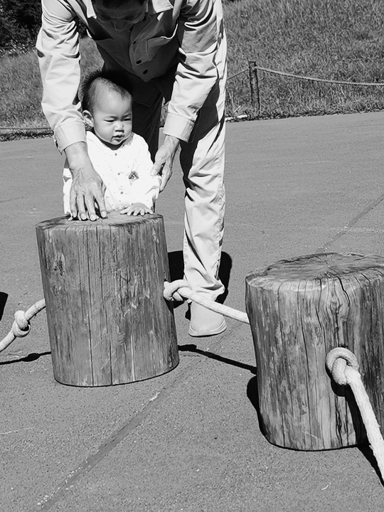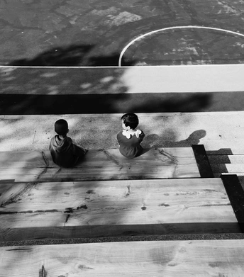 这张黑白摄影作品捕捉到了两个孩子坐在木质台阶上的场景,上方是一个篮球场的一部分,营造出一种独特的视觉氛围。光影的运用是作品的一大亮点,阳光透过树木的缝隙洒下,在台阶上形成了明暗交错的光影,增强了画面的层次感和空间感。构图上,摄影师巧妙地将孩子置于画面下方,上方留白,使得观众的视线自然而然地被引导至画面中心,同时,篮球场的线条也起到了引导视线的作用。虽然是黑白照片,但灰阶的过渡自然,细节保留完整。这幅作品不仅仅是记录了一个场景,更像是在讲述一个故事,引发人们对童年、游戏和成长的思考。摄影的优点在于对光影的敏感捕捉和富有创意的构图,使得画面具有艺术感和故事性。