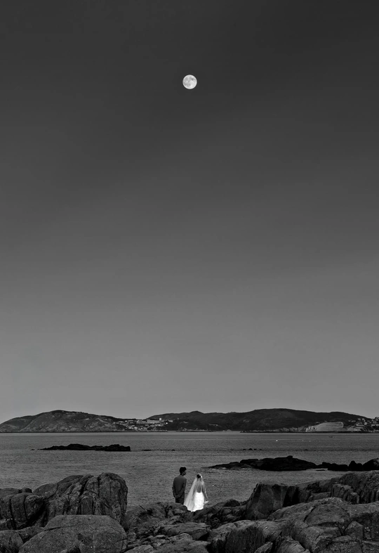 在黑白的浪漫格调中,一对新人相依于海边嶙峋的礁石之上。皎洁明月高悬夜空,洒下清冷光辉,远处山峦与大海在月色中朦胧交织。此刻,时间仿佛静止,他们的爱情在这静谧的海畔月色下,显得格外纯粹而坚定。