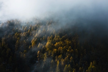 当雪山脚下的晨雾漫过初秋的彩林,斑斑点点的初雪为彩林添上了别样的色彩