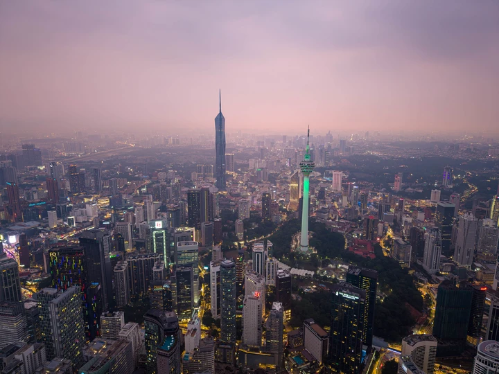 这张航拍图展现了吉隆坡的两大标志性建筑 —— 默迪卡 118 大厦与吉隆坡电视塔。默迪卡 118 大厦以 678.9 米的高度位居世界第二高楼。其外形如水晶塔,玻璃幕墙搭配切割立面,在阳光下闪耀着现代光芒。它是一座大型综合体,集甲级写字楼、零售空间于一体,还拥有东南亚最高的 “The View at 118” 观景台。吉隆坡电视塔高 421 米,是东南亚第一高塔,也是世界排名第四的通讯高塔。塔身呈伊斯兰祷告塔的形状,外部拱门设计彰显伊斯兰建筑风格。塔内设有观景台和旋转餐厅,为游客提供了俯瞰吉隆坡市区壮丽景色的绝佳视角。