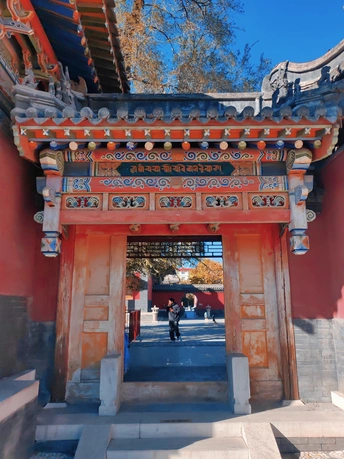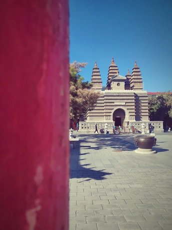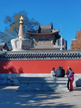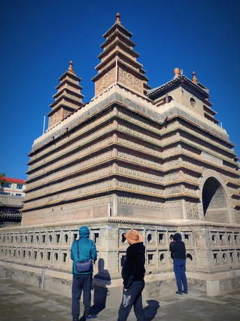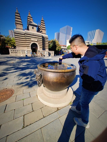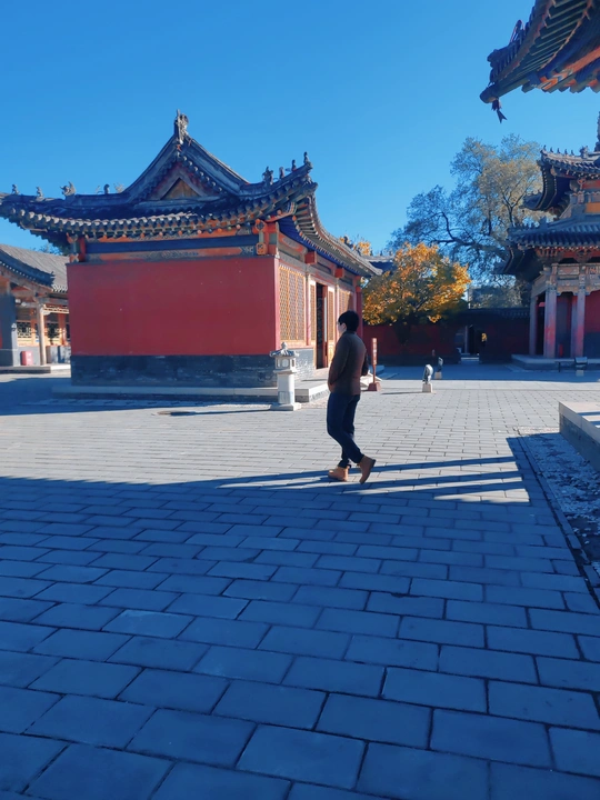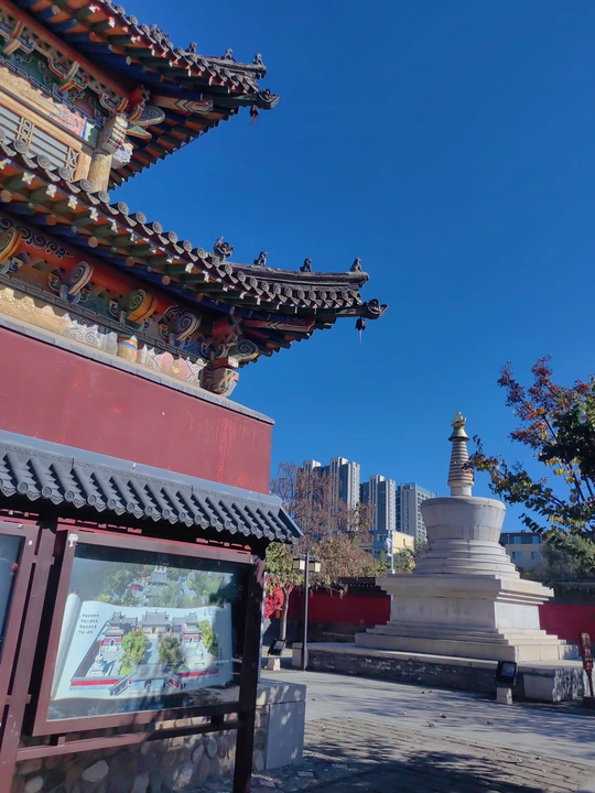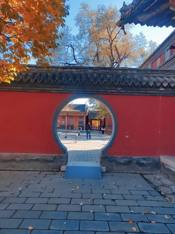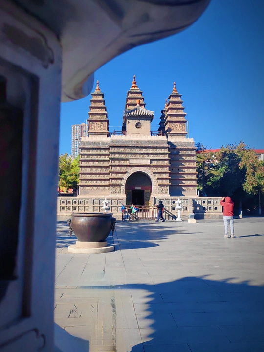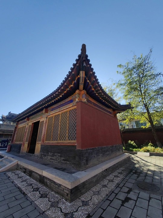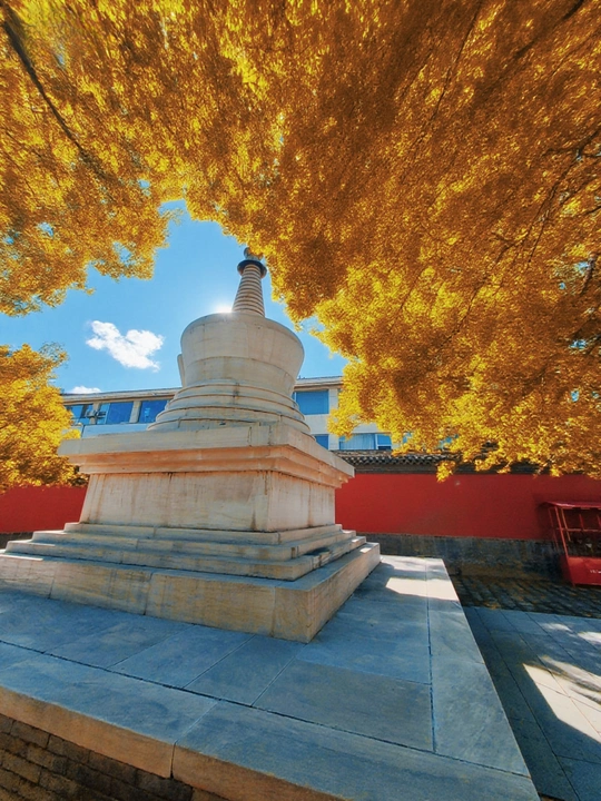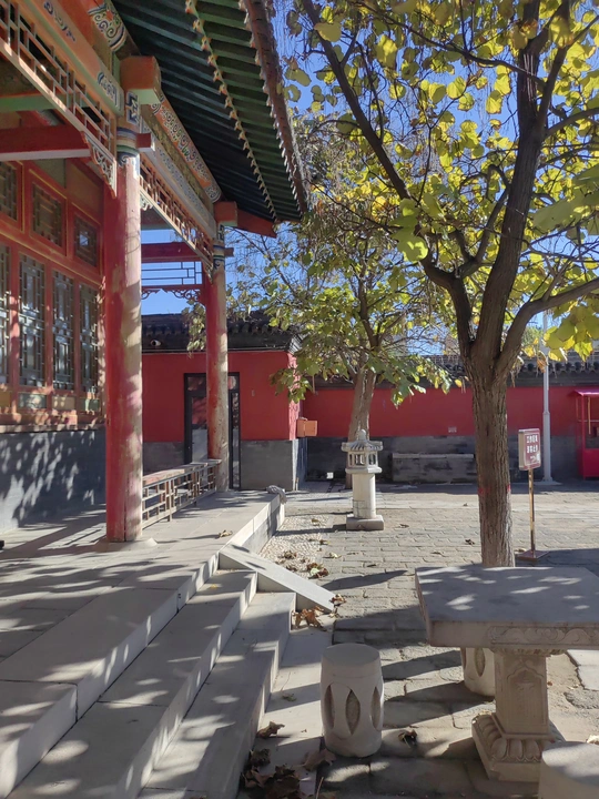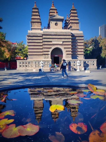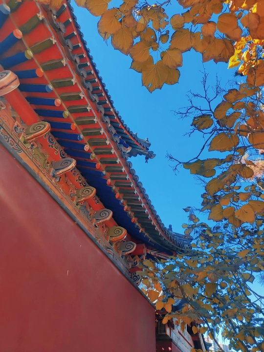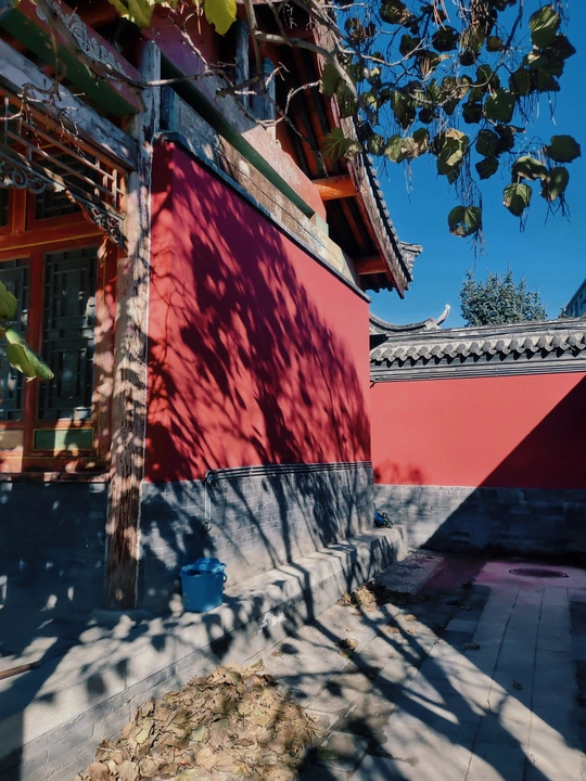 这张照片利用水面倒影,增加了画面的趣味性,视角选择也颇具心思。整体色彩较为明快,蓝天与建筑的灰褐色形成对比,水中的落叶增添了暖色调。 光影光线充足,倒影的运用增加了画面的空间感,利用倒影拍摄古建筑,角度新颖, 照片展现了古建筑的静谧与庄严,反映了历史与现代的交融,具有一定的文化内涵。