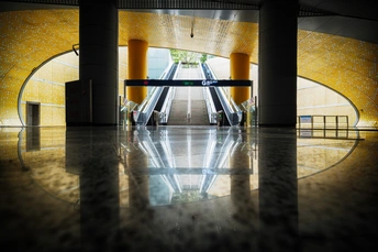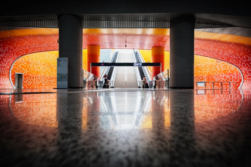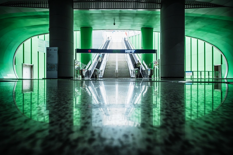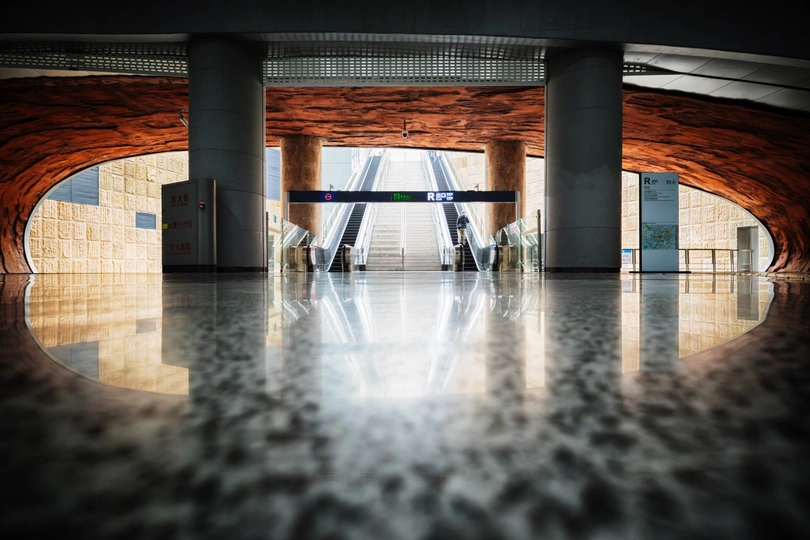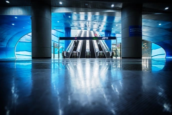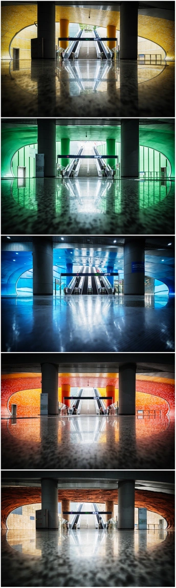 武汉光谷广场地铁站,其中有五个出口分别是代表了五行元素金木水火土,颜色非常时尚,建筑风格也十分有创意。