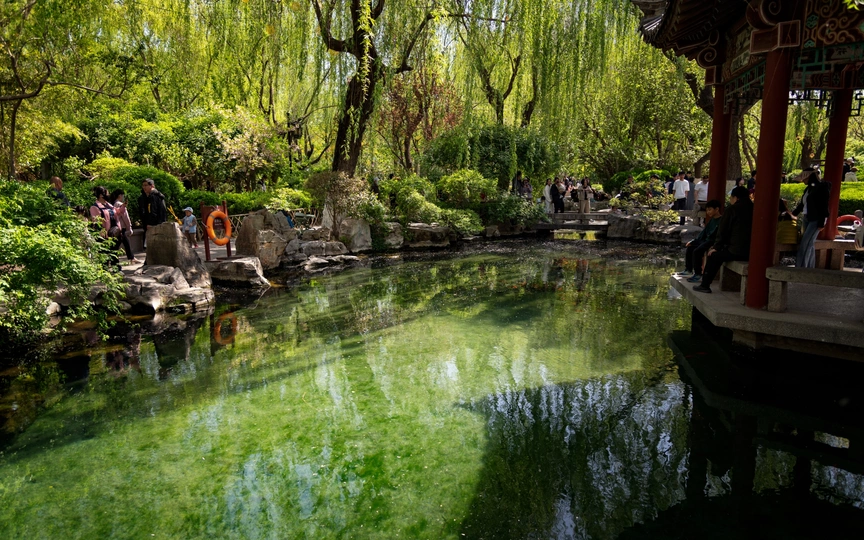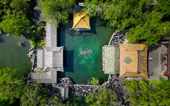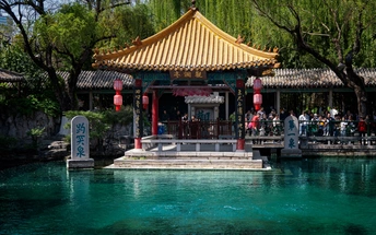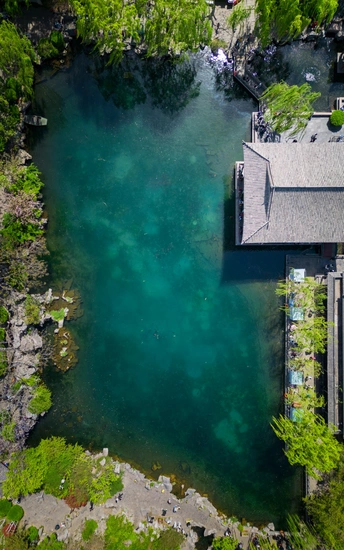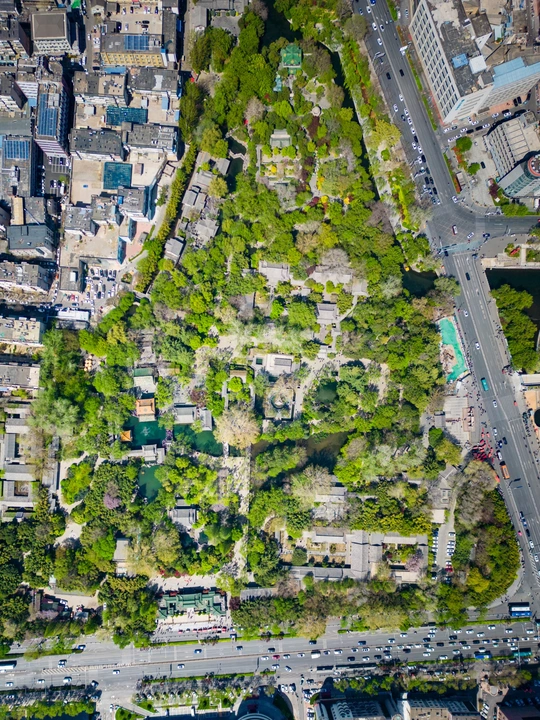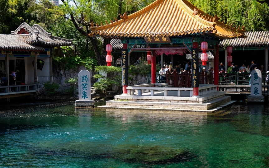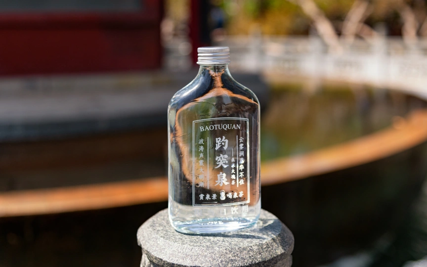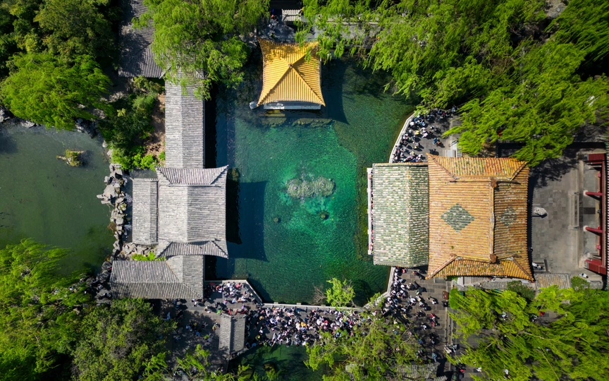 趵突泉水被乾隆皇帝册封为 “天下第一泉”,也是最早见于古代文献的济南名泉。作为济南三大名胜之一,这片以泉为魂的园林,从航拍视角看,古建亭台与澄澈泉池在绿林簇拥中与现代都市接壤,是来济游客的必打卡地。 亲临趵突泉,才懂 “皆若空游无所依” 的意趣 —— 泉水清透如碧,潭中鱼群或红或黑,千百尾在水中悠然悬浮,阳光穿柳影洒在水面,波光与泉涌共舞,静美中透着灵动,让人忍不住驻足,看这份澄澈里的自然生机。 观澜亭畔,“趵突泉” 与 “第一泉” 的石碑静静伫立,见证着泉水千年的喷涌。用喝完茶水的纪念瓶装一瓶泉水留作纪念,将天下第一泉的清冽与诗意,装进了旅客的记忆里。