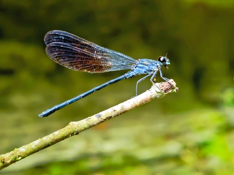 它是林涧里偷藏的幽蓝碎片——墨色翅翼晕着琥珀般的光泽,如薄纱裹着细碎星子,纤长的青蓝躯体轻栖于沾着潮气的枝桠,黑亮复眼凝着朦胧绿意。周遭是浸了水汽的柔绿背景,风裹着草木的湿凉掠过,时间在此处慢成一帧静画,只余它与林涧的呼吸,轻得像一场不愿惊扰的梦。