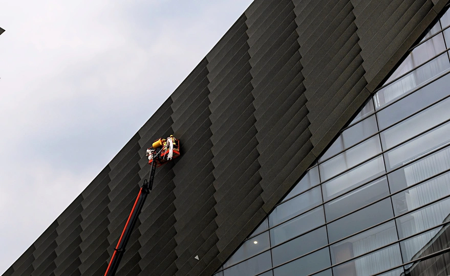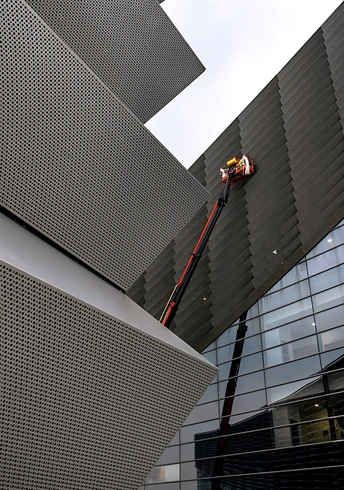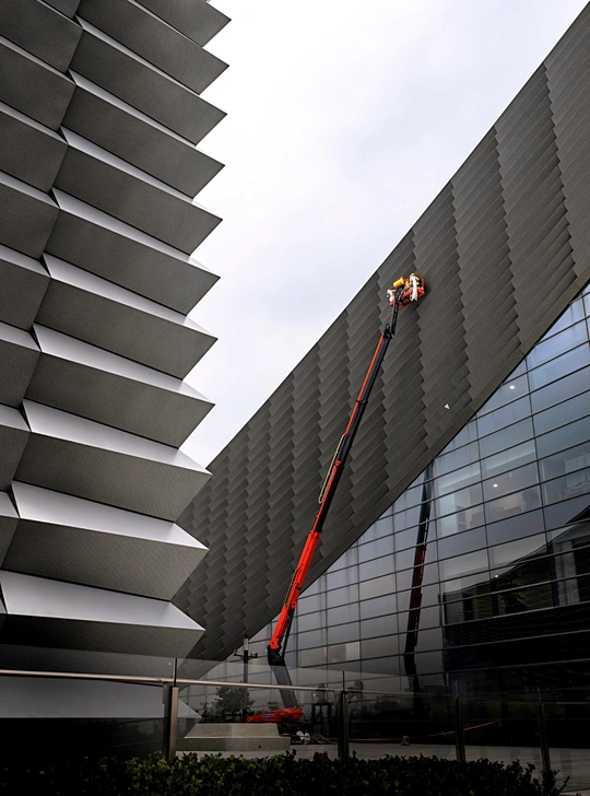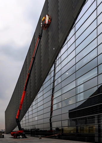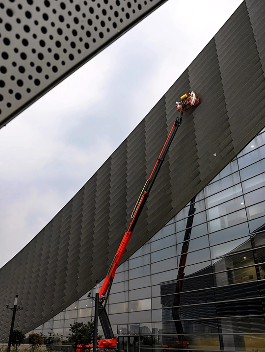 城市的天际线下,高空作业者如灵动的音符。红色的机械臂,于冷峻建筑间穿梭,每一个动作,都是与天空的对话。