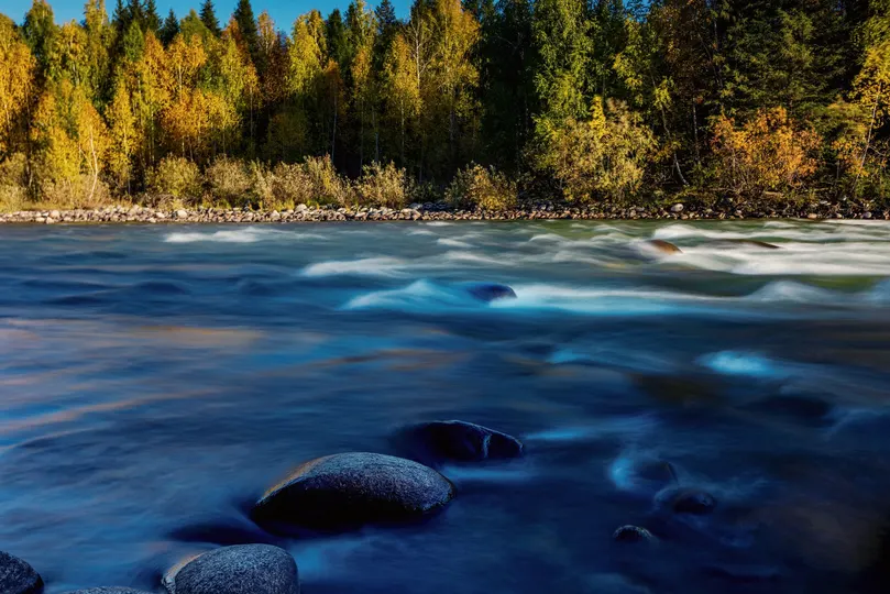 夕阳把最后一缕暖光斜斜铺在禾木河的水面,浪花层层叠叠,似翩翩舞者。岸上的林木渐渐换上秋装,各种颜色交织成一片斑斓,与河水的奔涌相和。