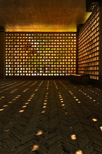 光影是建筑的语言,而这里,每一块砖都在书写诗句。 纵横交错的格栅墙,将外界的绿意与天光切割成千万个流动的光斑,如同大地的瞳孔,凝视着时间的轨迹。阳光穿过砖孔,在地面织就细密的金线,与墙面的几何秩序相映成趣——粗粝的材质包裹着温柔的光影,工业感的网格框住了自然的呼吸。 角落里的长凳静默如碑,等待着某个灵魂在此与光影对坐。当风穿过砖缝,当树叶在窗外摇晃,墙面上的光斑便会轻轻颤动,仿佛整座建筑都在低声吟唱。这里没有繁复的装饰,只有光、影、砖与自然的对话,简单,却足以让时间慢下来,让心在明暗交错间,找到片刻的安宁。 原来最美的设计,是让建筑成为自然的画布,让光影成为流动的艺术。