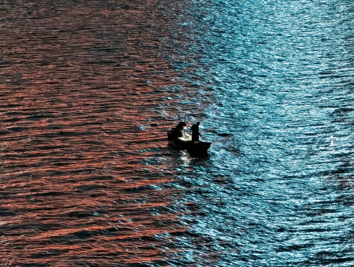夜幕降临,城市霓虹灯照耀在江面,一艘渔船开始了夜间工作。
