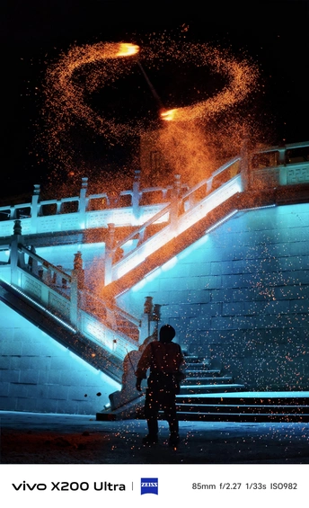 夜幕深沉,一座泛着幽蓝冷光的阶梯静静伫立。一人的身影在其前显现,于黑暗中舞动炽热的火花。火花如金色的星芒在夜空中肆意飞溅、盘旋,瞬间点亮了夜的深邃。冷暖色调的强烈碰撞,营造出奇幻而震撼的视觉效果,仿佛一场光与火的神秘仪式在夜色中悄然上演。