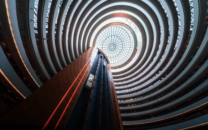 螺旋环廊,穹顶天光,电梯穿梭间,建筑的艺术与张力尽显,一眼便知是城市地标里的视觉惊喜。