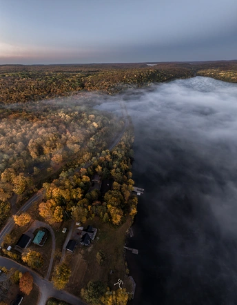 阿岗昆国家公园附近的莉丝湖畔。湖面被浓雾笼罩着。飞上500米看到了这宛如仙境的湖上秋色的黎明。