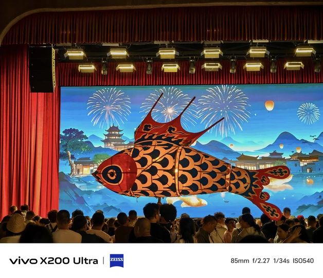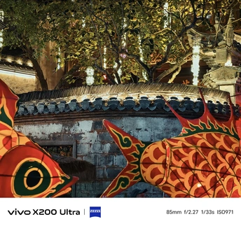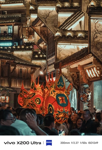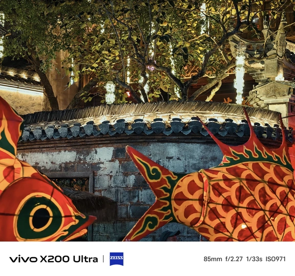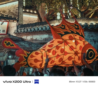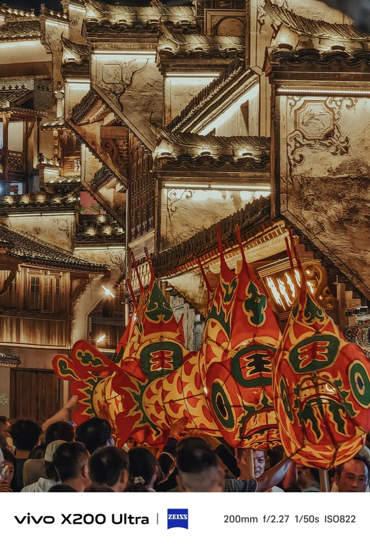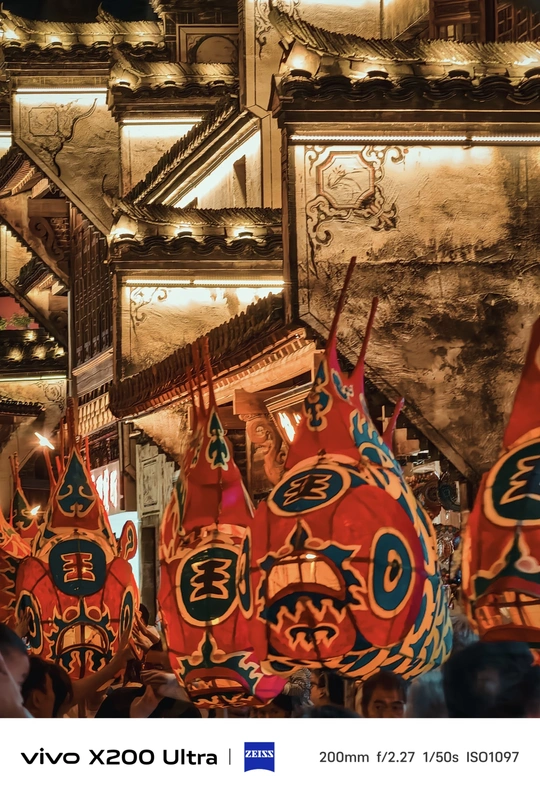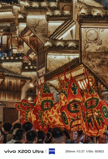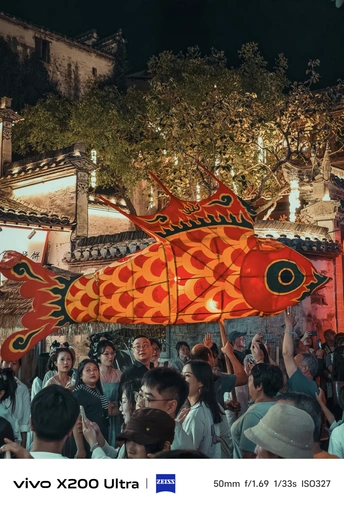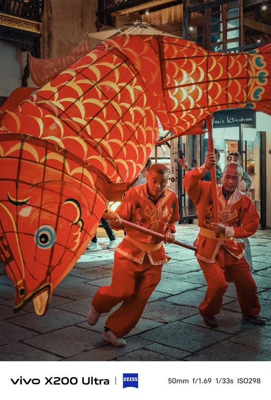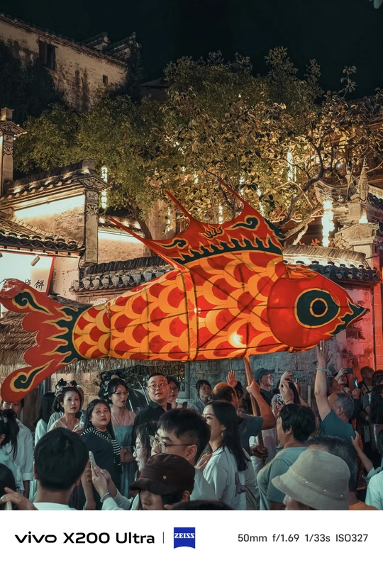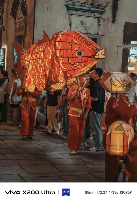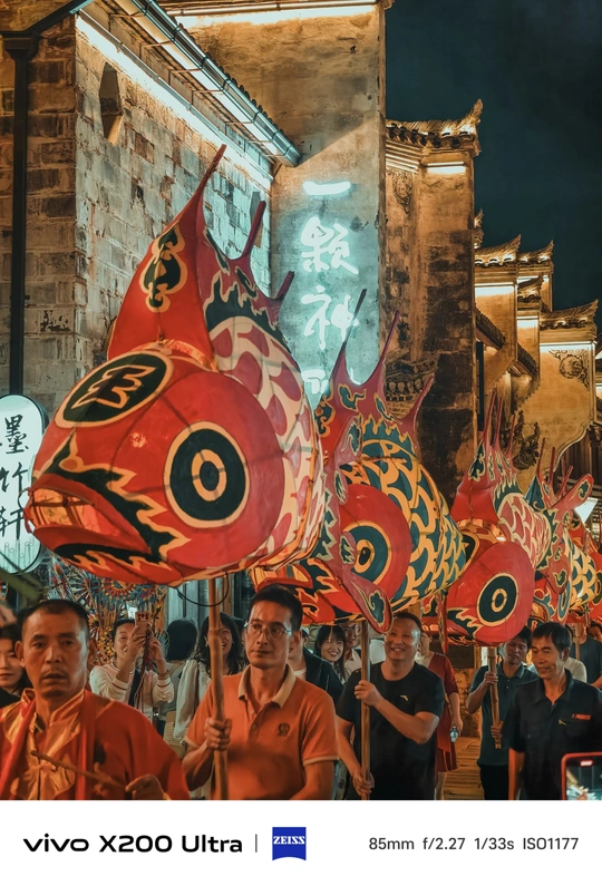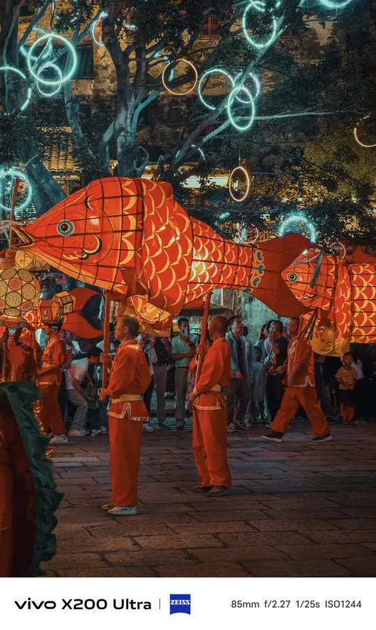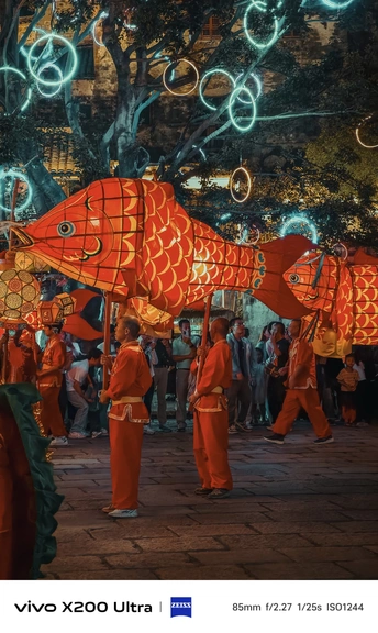 夜幕降临,古老街巷华灯初上。一群人手持色彩艳丽、造型灵动的鱼形花灯穿梭其中。鱼灯上的图案精美,红底搭配着黑黄花纹,仿佛赋予了鱼儿鲜活的生命力。背景中的古建筑古朴厚重,与鱼灯相映成趣,共同绘就了一幅充满民俗魅力的动人画卷,传递出传统节庆的热闹与喜庆。
