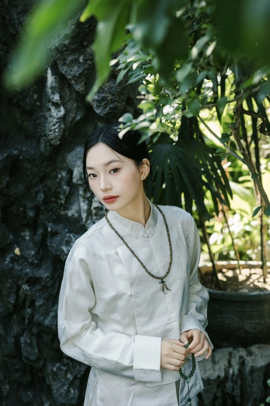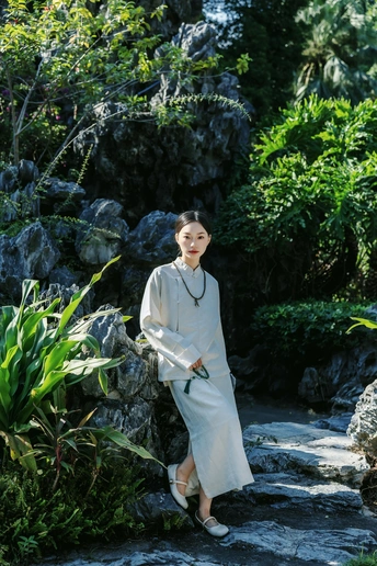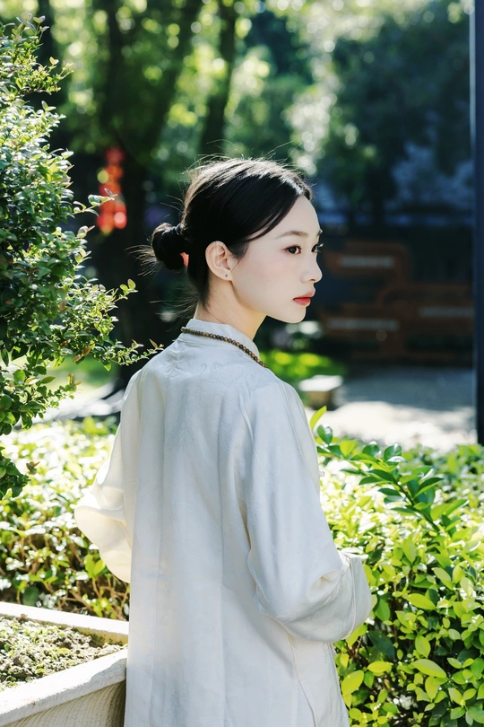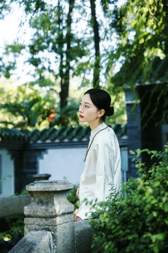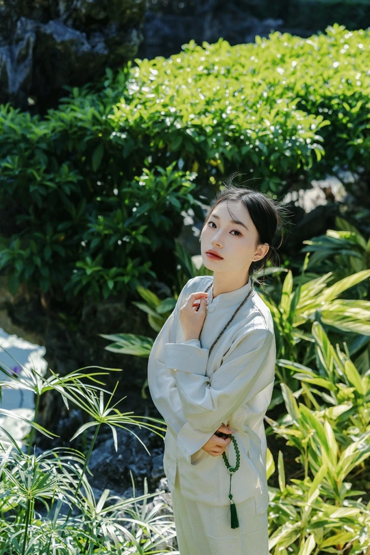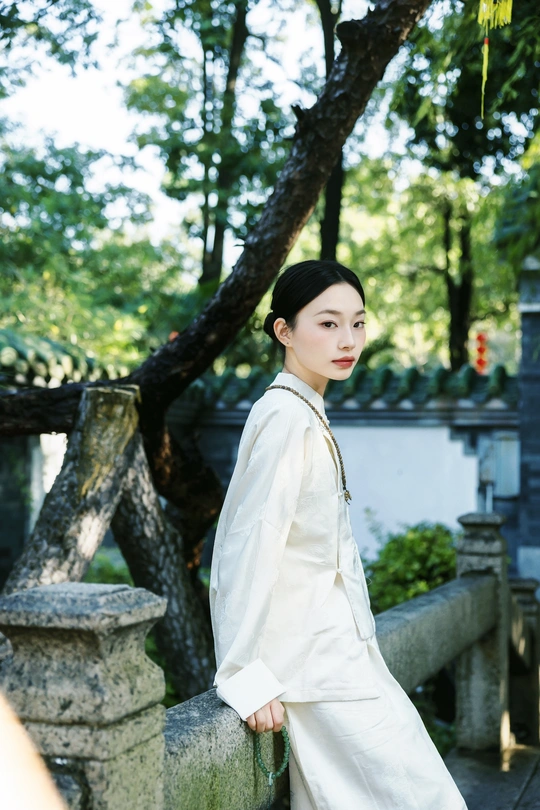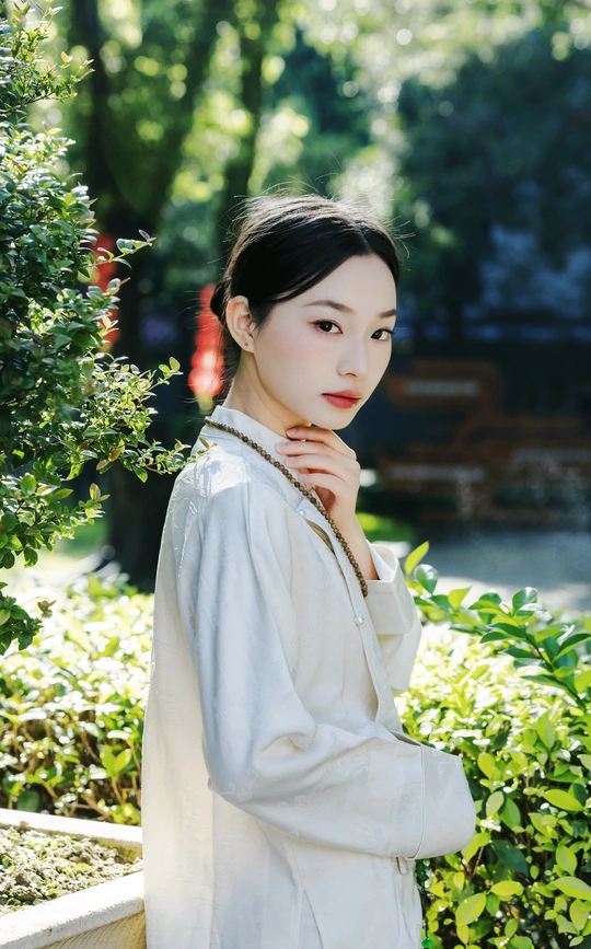 《素伊问禅》 出镜:伊伊 地点:醉观公园 白裳女子执绿玉珠串,踱过石桥曲栏。 红灯笼在竹影间题写,光斑与佛珠一同垂落, 将长卷染成会呼吸的水墨。