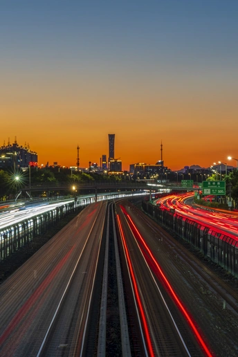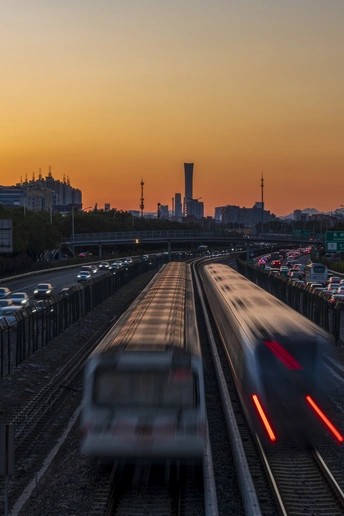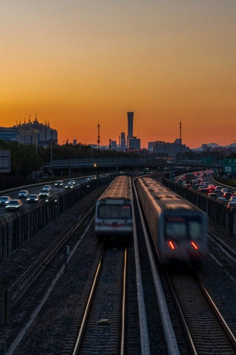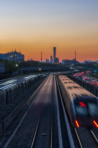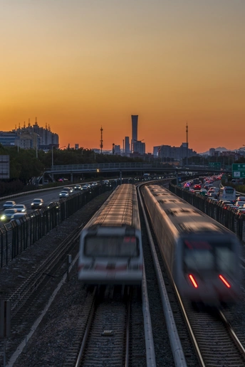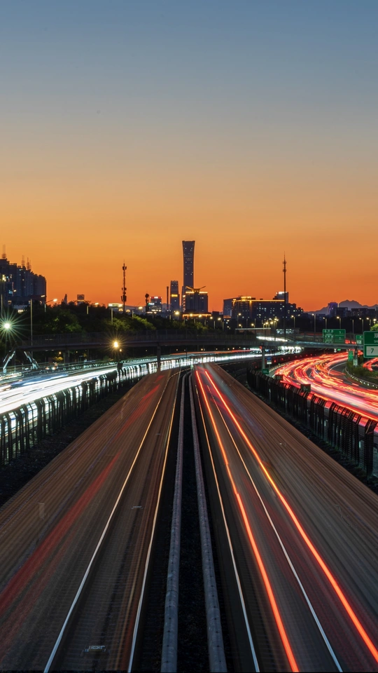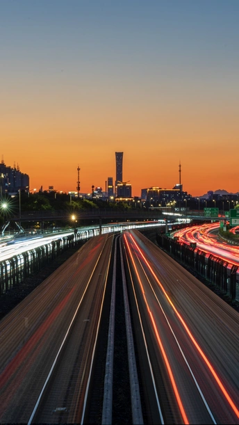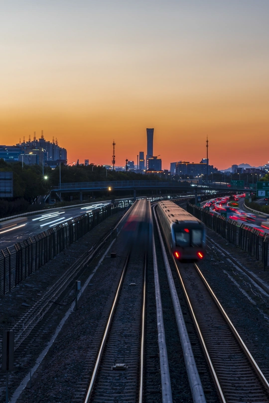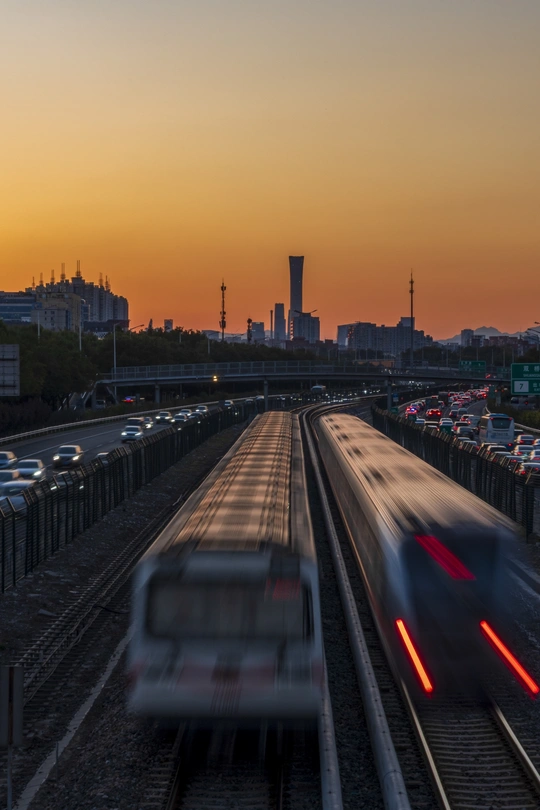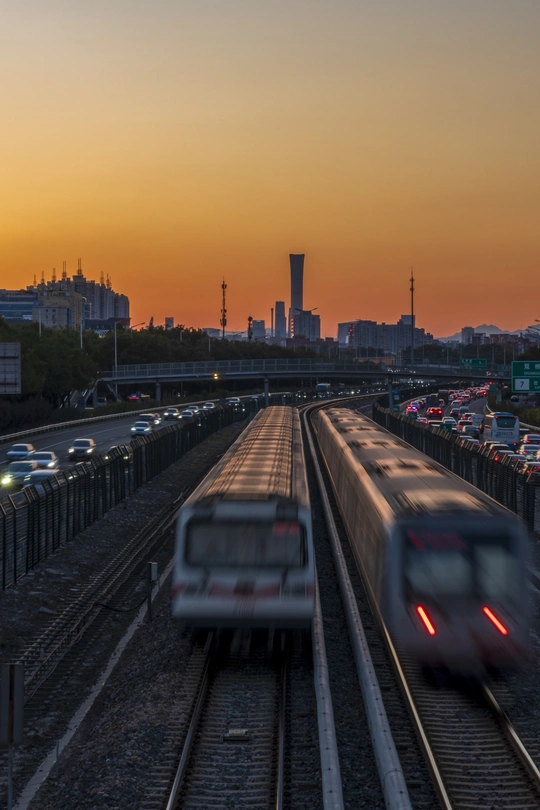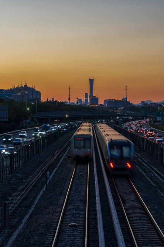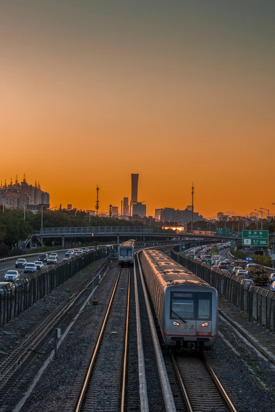 橙黄暮色浸满天际时,1号线的双列列车在轨道上扯出光轨,中国尊的剪影在楼宇间站成坐标。 半世纪的交通动脉,与时代地标的同框,是北京的过去与现在,沿着轨道与天际,同步汇入夜色里的烟火人间