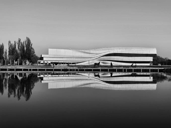 建筑如流动的艺术雕塑,在静水之上拓印出对称的律动。黑白影调里,它是凝固的浪,是折现的风,以先锋的姿态与自然对话,在水镜的映照下,谱写出一首关于几何与诗意的建筑狂想曲。每一道曲面都是思想的褶皱,每一次倒映都是艺术的回响,于极简中见磅礴,于静态中藏奔涌。