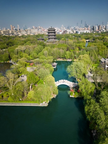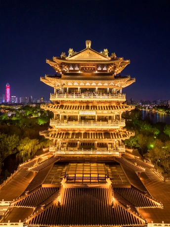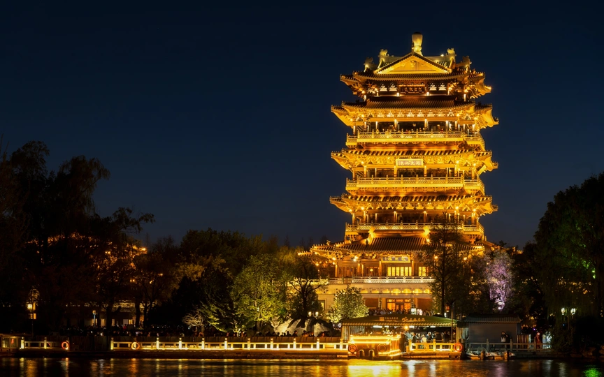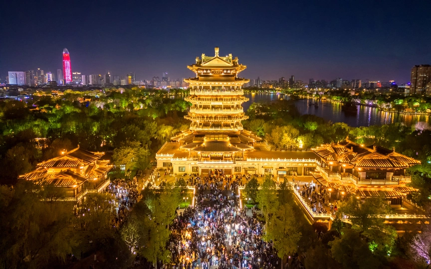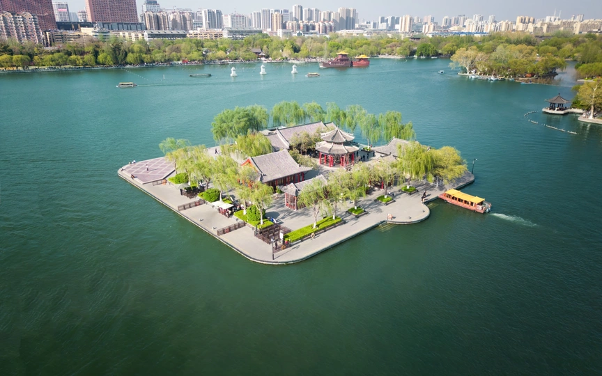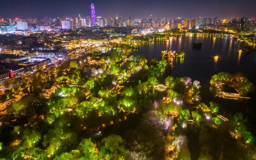 大明湖是济南 “三大名胜” 之一,有 “泉城明珠” 美誉,水域澄明、古建雅致,“一阁二园三楼” 等景观如明清山水长卷。你可泛舟观涟漪碎天光,或漫步赏柳丝染诗意,尽览湖光温婉。 大明湖的 “浪漫符号” 夏雨荷,原版于正谊广场簪花着紫裳,眉梢娇羞、腮边妩媚,是无数人的 “初见心动”。如今虽在北岸钢琴广场新建 “湖畔雨荷” 2.0 版,原版神韵仍在时光里鲜活,成明湖柔情一笔。 “江北第一楼” 超然楼,以铜质构件筑就,融南北建筑之美,立于汉白玉台基上典雅恢弘。每至夜幕,楼体亮灯瞬间成焦点,璀璨光芒里是泉城千年风华,游人打卡处皆是与济南古今的对话。 从雨荷温婉到超然璀璨,大明湖以灵秀与厚重讲着济南故事。