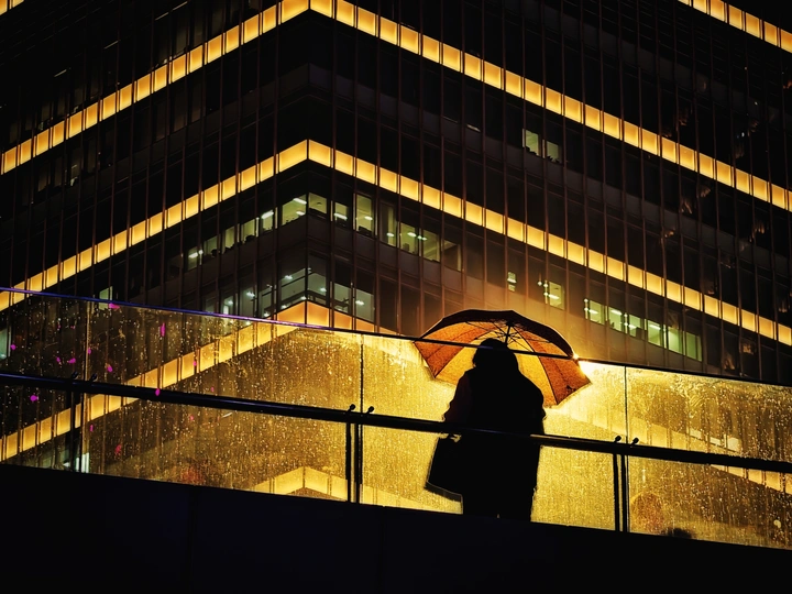 都市霓虹在雨帘中晕染成星河,伞下依偎的剪影被琥珀色光晕勾勒,玻璃幕墙倒映着城市旅人孤独的背影。