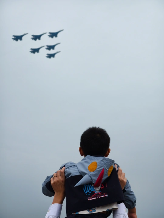 画面中,一双有力的手稳稳地将孩子高高举起,孩子专注地仰望着天空中编队飞行的战机。战机整齐划一地翱翔天际,展现出磅礴的力量与威严。这一刻,孩子眼中或许种下了蓝天的梦想,而那空中的战机,正是守护与希望的象征,传递出对未来、对强国力量的美好憧憬。