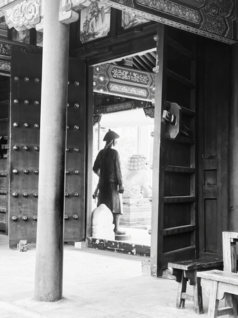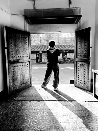 色彩:黑白影调简洁有力,去除了色彩的干扰,工更突出了光影和结构。 光影:光线从门外摄入,在地面形成有趣的阴影,增加了画面的层次感。 构图:以门框作为前景,形成画框式构图,增加了纵深感。 主题原创性:通过门框向外看,表达了一种探索、向往的主题。