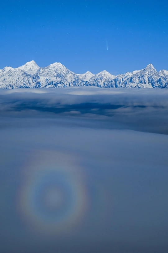 我用无人机拍到了彗星划过贡嘎群峰的震撼画面 正值满月,还有云海,月照银山,佛光的加持,拍到如此震撼的画面,这很有可能是独一份无人机拍到A6莱蒙彗星和蜀山之王群峰景色的照片(后期天气变差彗星远离),真的是太幸运了!