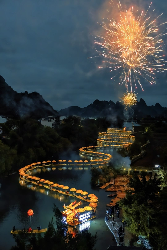 阳朔遇龙河的夜,是一场流动的梦境。 金龙巡游时刻,江面被暖黄的灯火点亮,竹筏排着队沿着河道蜿蜒,宛如金色的星河在水面铺展。远处的山峦在夜色中若隐若现,与江上的灯火交相辉映。烟火在天空中炸开的一刻,仿佛所有烦恼都被驱散,只剩下喜悦与浪漫。