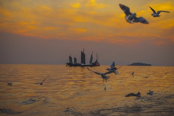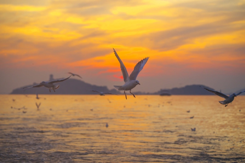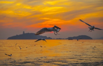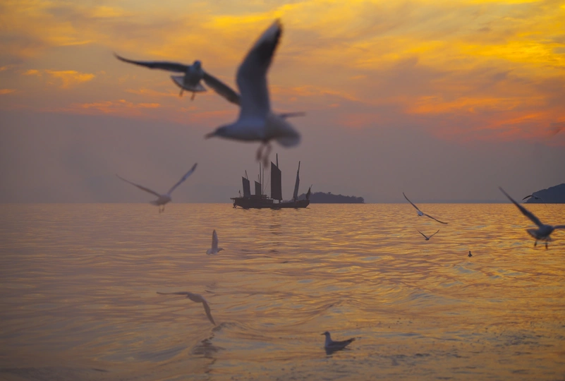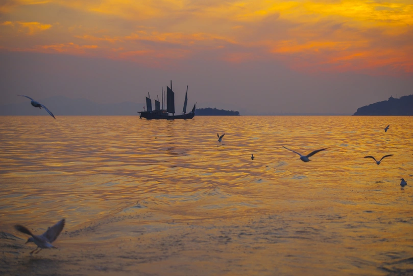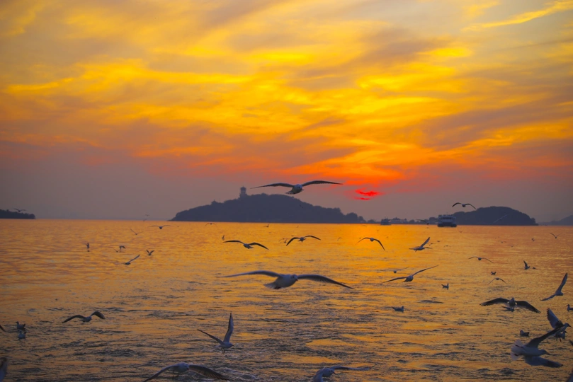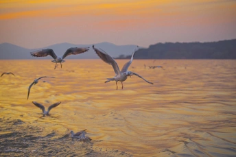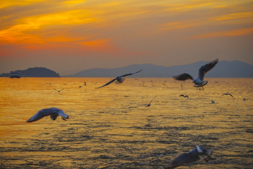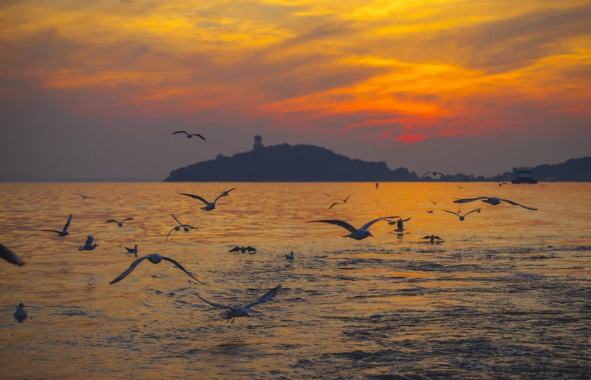日落后的太湖成了橘子海,湖面上盘旋的红嘴鸥成了“海上”最靓丽的风景。
