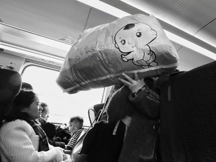 高铁座椅的缝隙里,那袋鼓囊囊的包裹压着胳膊弯,印着的卡通娃娃圆眼弯眉,正和窗边那小孩的亮眼睛对了个正着——一个装着新棉服的软和,一个盛着窗外的好奇,都裹在车厢轻轻的晃荡里,往家的方向飘。
