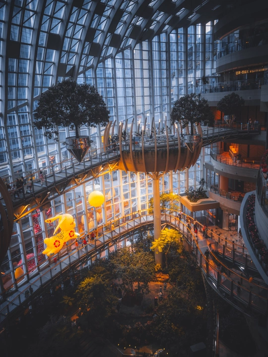 重庆玻璃穹顶下的“城市森林”,多层环形步道环绕,悬浮树与绿植共生,黄色萌兔装置成为焦点,热闹又有设计感。