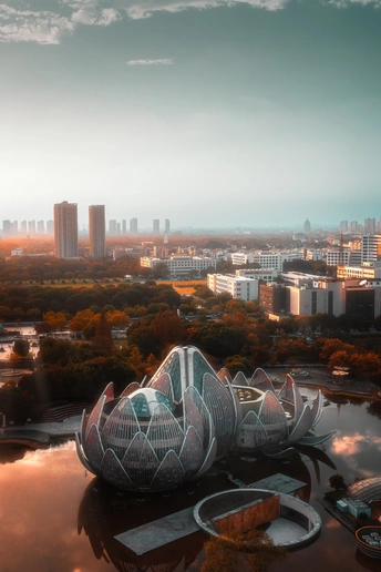 11月12日的常州,秋意正浓。我站在高处,看莲花馆如一朵金属莲花绽放在水面,金属纹理在秋日余晖里泛着冷光,却与周围暖黄的树影、远处朦胧的城市建筑奇妙相融,秋水倒映着天光与建筑,这一刻,常州的秋在传统与现代的交织里,美得让人心醉。