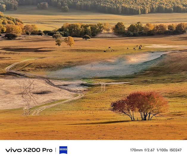 秋阳给草原镀了层暖金,蜿蜒小径牵起浅溪与疏林,几匹牧畜踱过绒毯似的草甸,晚枫把最后一抹艳色揉进风里。镜头截住这帧辽阔里的温柔——是季节写给大地的、烫着鎏金封边的信。