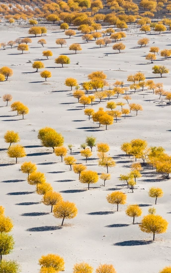 雅鲁藏布大峡谷的沙滩秋色,白色沙滩和金色的彩林。