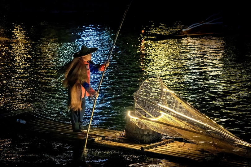 夜渔灯影里,竹筏泛流光。夜幕低垂,水波闪烁。捕鱼人身披蓑衣头戴斗笠,持竿立筏,渔网的光与岸边灯影交相辉映,组成了一幅静谧而诗意的夜渔图。