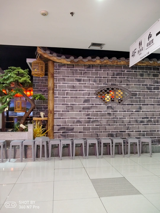 南宁百盛步行街广场四楼随拍,这个餐厅的外墙装修风格很有古典气息。