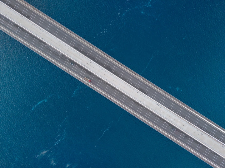 清晨日出后的伊斯坦布尔海峡俯拍,大桥横越博斯图鲁斯海峡,海鸥汽车同行。