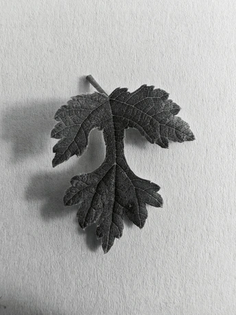 它躺在素白的纸上, 像片凝固的云影, 脉络是风刻下的诗行, 边缘的齿痕, 藏着阳光咬过的痕迹。 灰调里, 每道纹路都在呼吸, 把秋的私语、 树的眷恋, 凝成这枚 沉默却饱满的 象形文字。