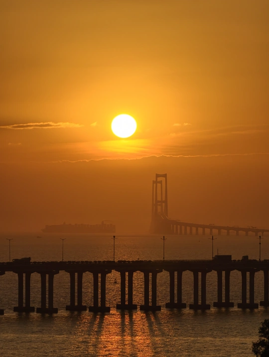 橘色夕阳把海面熔成金箔,两座大桥在日落里叠成城市的脊梁。近桥车流织着烟火,深中大桥挑着暮色,浪尖晃碎的光,是傍晚写给江海的温柔诗行。