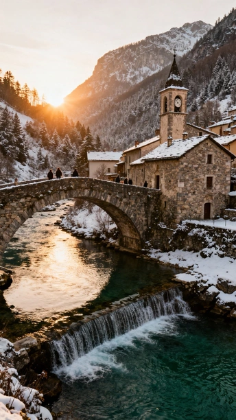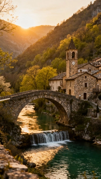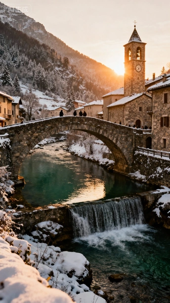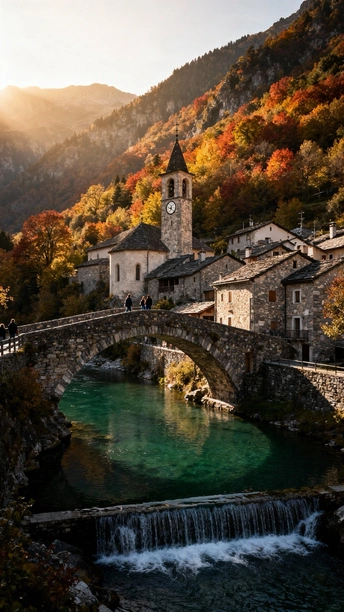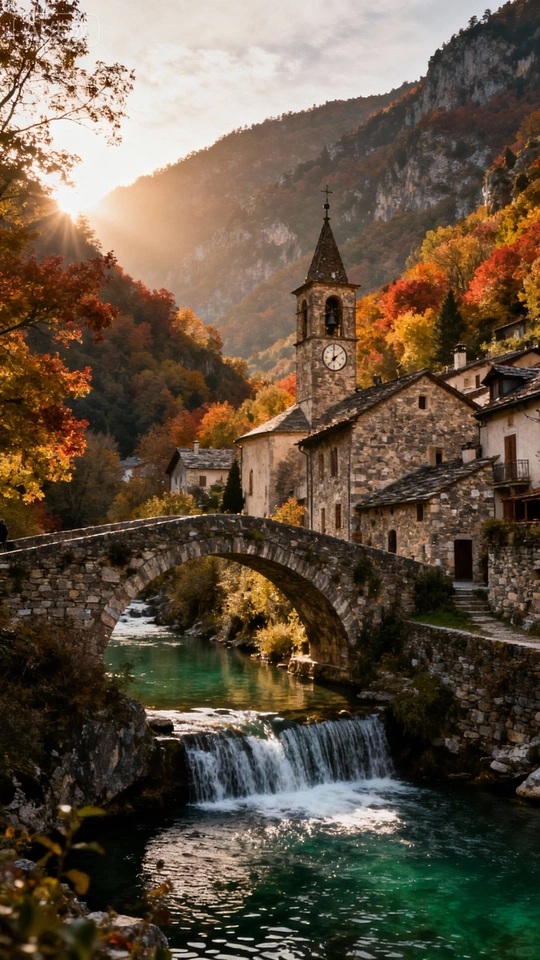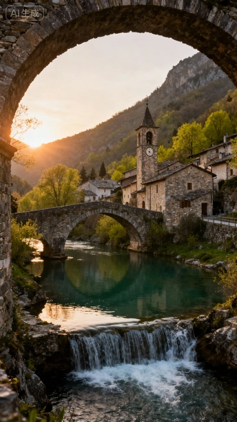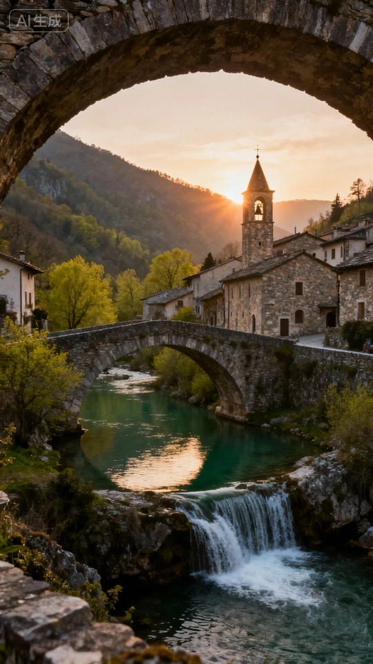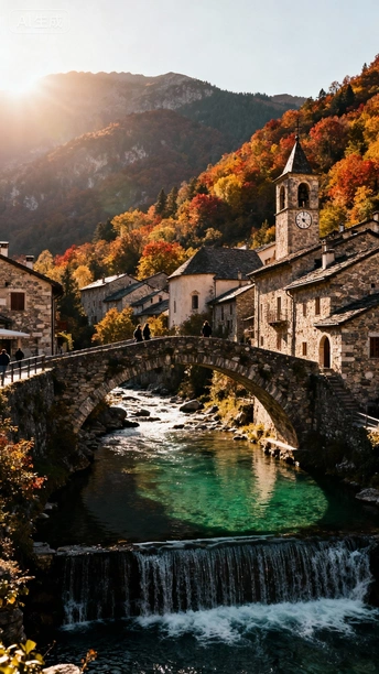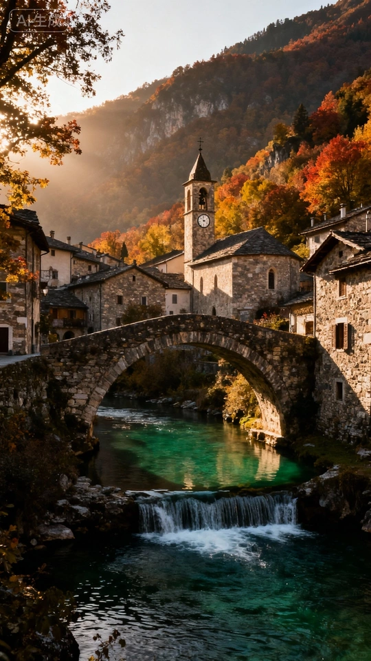 这张照片简直是秋天的童话故事!色彩方面,红、橙、黄的秋叶与碧绿的河水形成了鲜明对比,色彩和谐而富有层次。光影运用也很到位,日出时的光线柔和地洒在建筑和山峦上,营造出一种温暖、宁静的氛围。构图上,桥梁、教堂和瀑布巧妙地组合在一起,引导视线,主体突出。后期处理恰到好处,色彩和对比度都得到了增强,但又不会显得过于人工。照片的创意和主题表达也很棒,展现了秋日乡村的宁静和美丽。情感共鸣方面,照片能够引起观者对田园生活和自然风光的美好向往。思想深度上,照片展现了人与自然的和谐共生,引发了人们对环境保护和文化传承的思考。