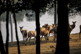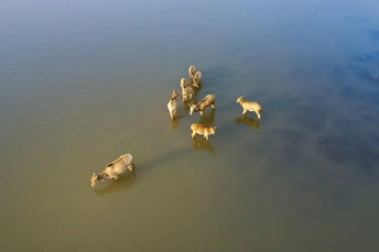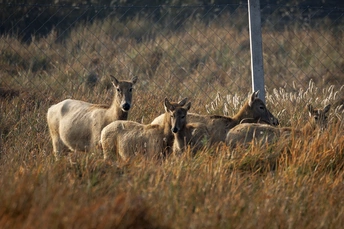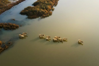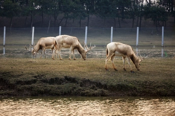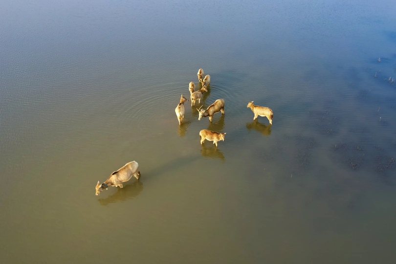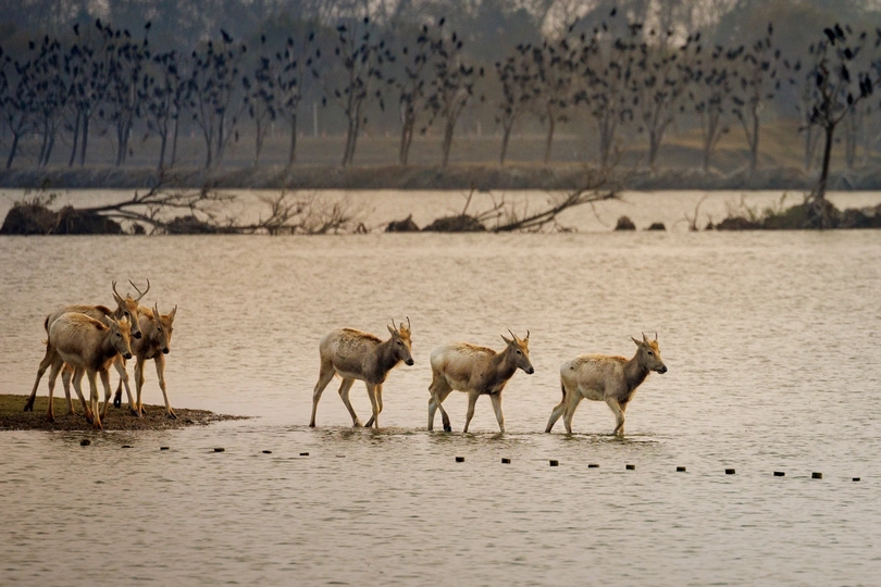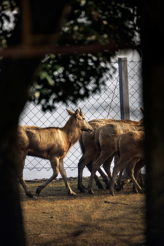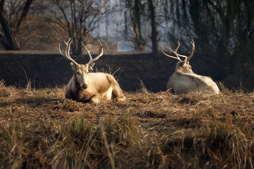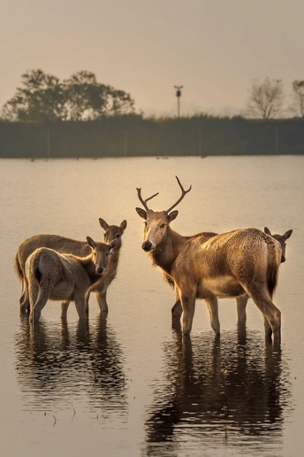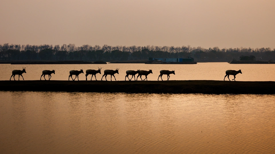 芦苇晃着风,水洼盛着光,这群长着“马脸鹿角驴尾牛蹄”的精灵,把湿地当成了游乐场—— 有时是草坡上撒欢的毛团,有时是浅滩里探头的剪影,连阳光都肯为它们慢下来,把金边镶在鹿角上。 它们是麋鹿,是这片湿地的主人。
