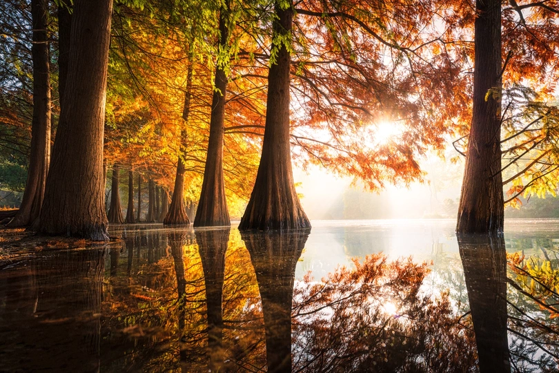 秋日的南京燕雀湖,落羽杉树叶渐红,能看到又黄转红的色彩变化。在日出前我就提前就位等待,只为了拍到日出时的这一刻。当清晨的第一缕阳光穿透树林,分割出丁达尔的光线,我把相机贴近水面,按下快门得到了这张照片。 清晨的水杉林与水面倒影相印成趣,更添一份秋色 Shot on Sony a7m4