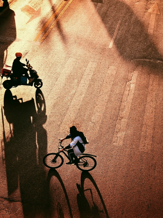 夕阳把马路焐成蜜色的绸, 一辆单车,一辆电驴, 碾过光的褶皱, 影子在身后拖得悠长, 像两封未拆的 黄昏的信。 一个载着生活的重量, 一个驮着青春的行囊, 在这鎏金的幕布上, 各自踩着 与时光共振的 节拍, 驶向 不同的方向, 却共享着 同一片 暖的余响。