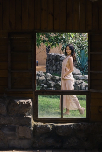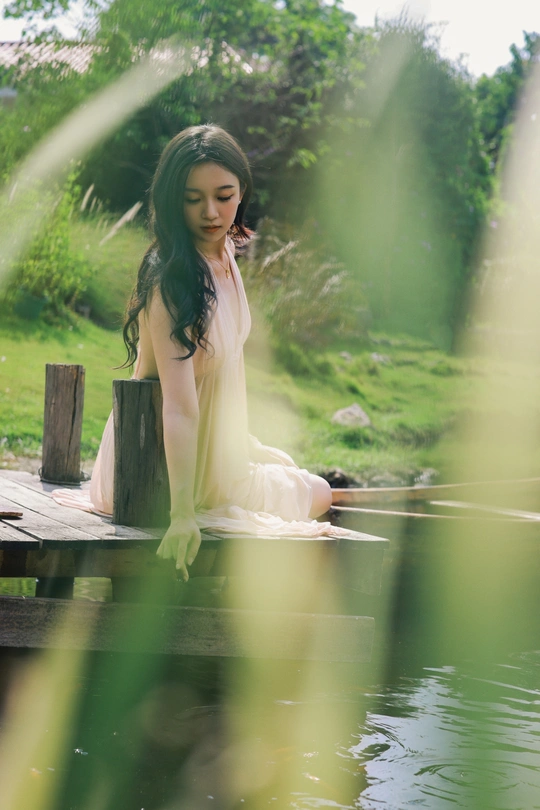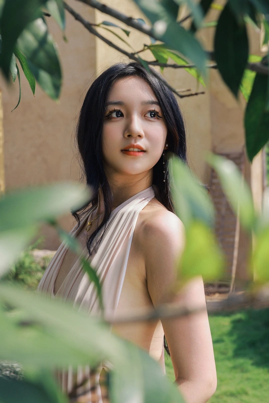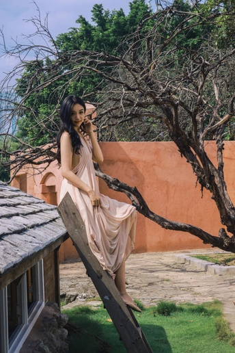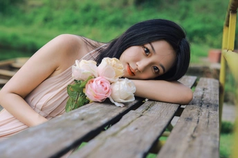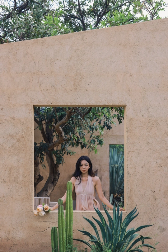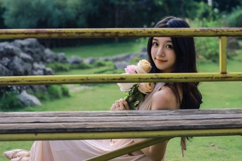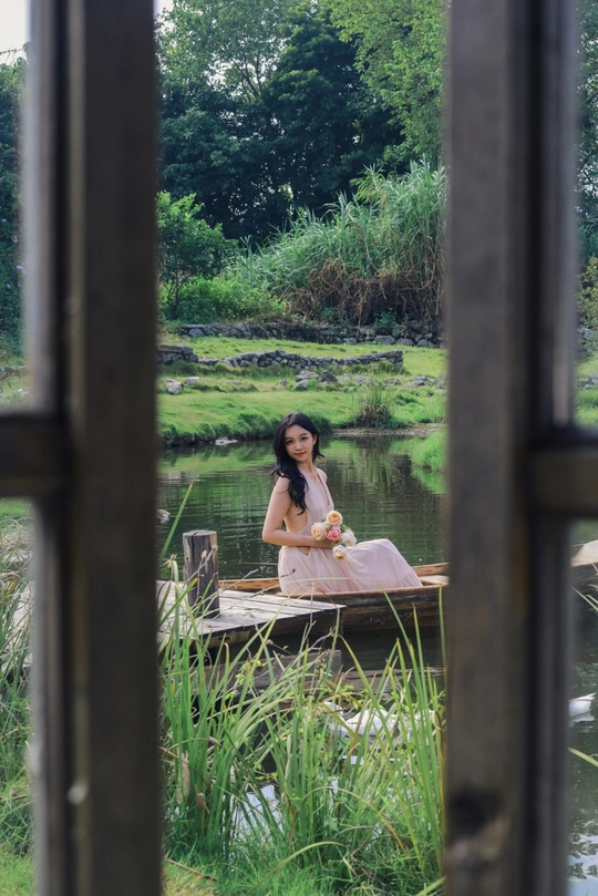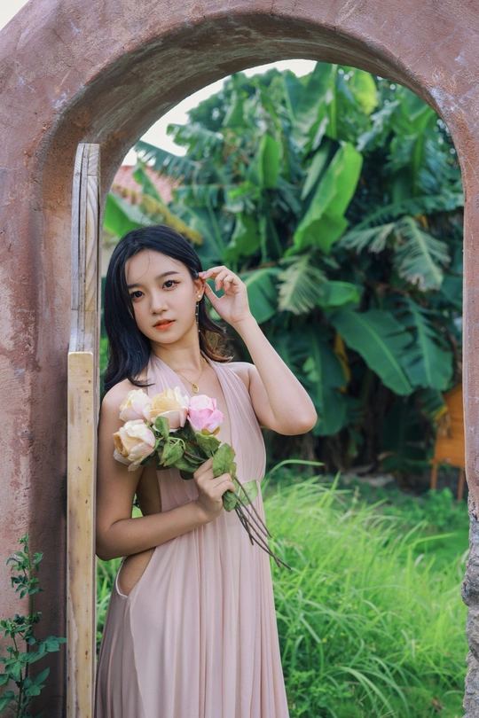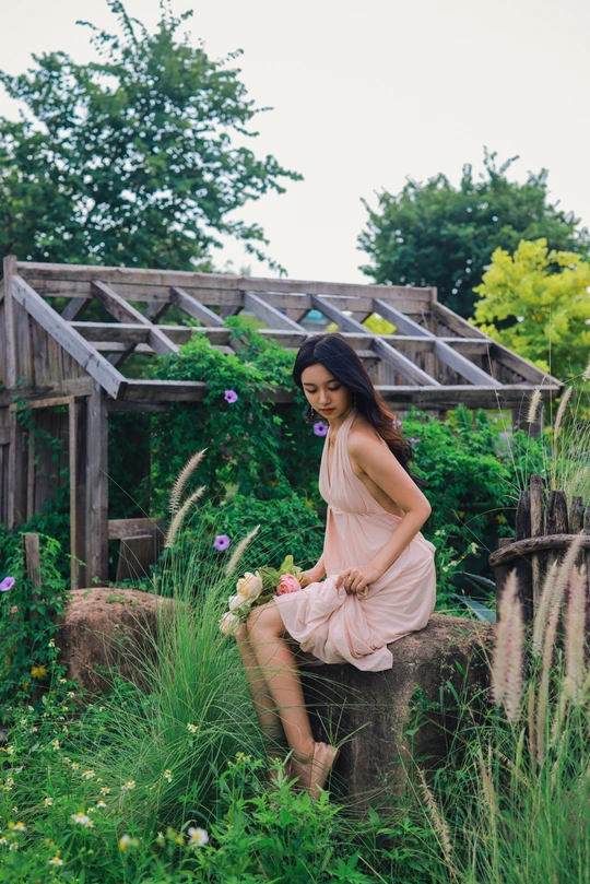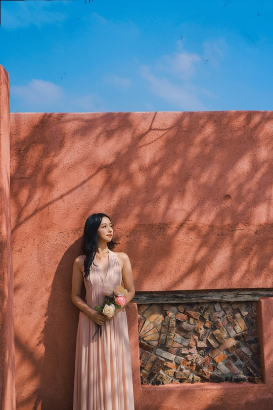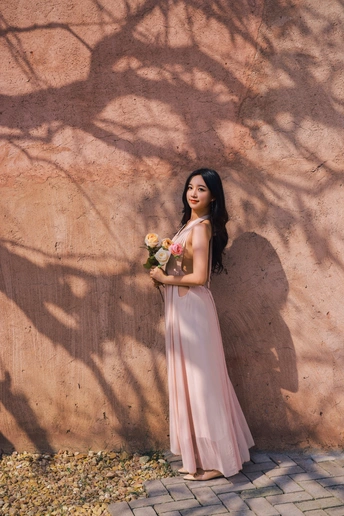 闲静午后, 粉裙裹着风, 花束碰碎了墙影。