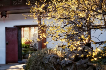 冬日暖阳下,腊梅花在阳光下如闪束金星